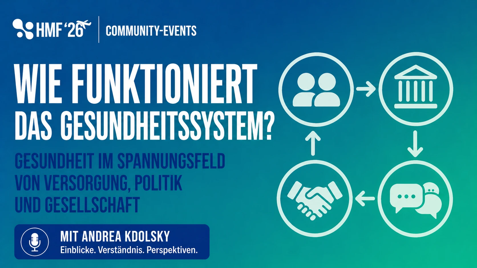 Beim Community Event mit Andrea Kdolsky erhältst du spannende Einblicke in die Herausforderungen und Zukunft unseres Gesundheitssystems. Im interaktiven Kamingespräch zeigt sie, wie Versorgung, Politik und Gesellschaft zusammenwirken – und welche Lösungen es für eine nachhaltige Gesundheitsversorgung braucht.